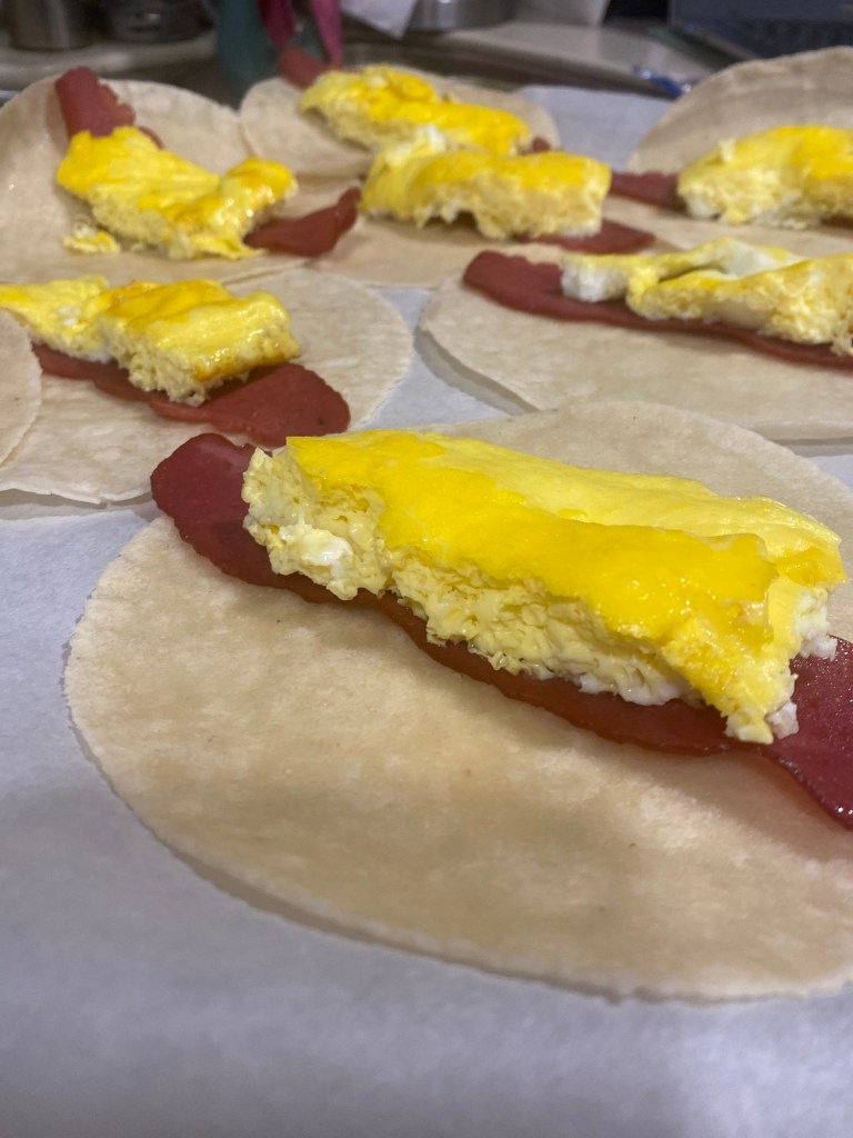 - Take both items out, cut eggs into rectangles to fit on tortilla.